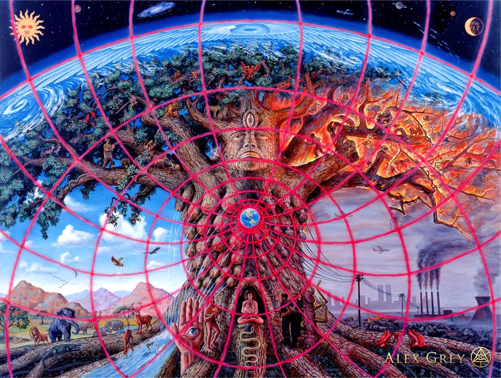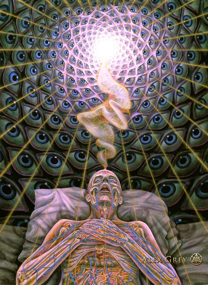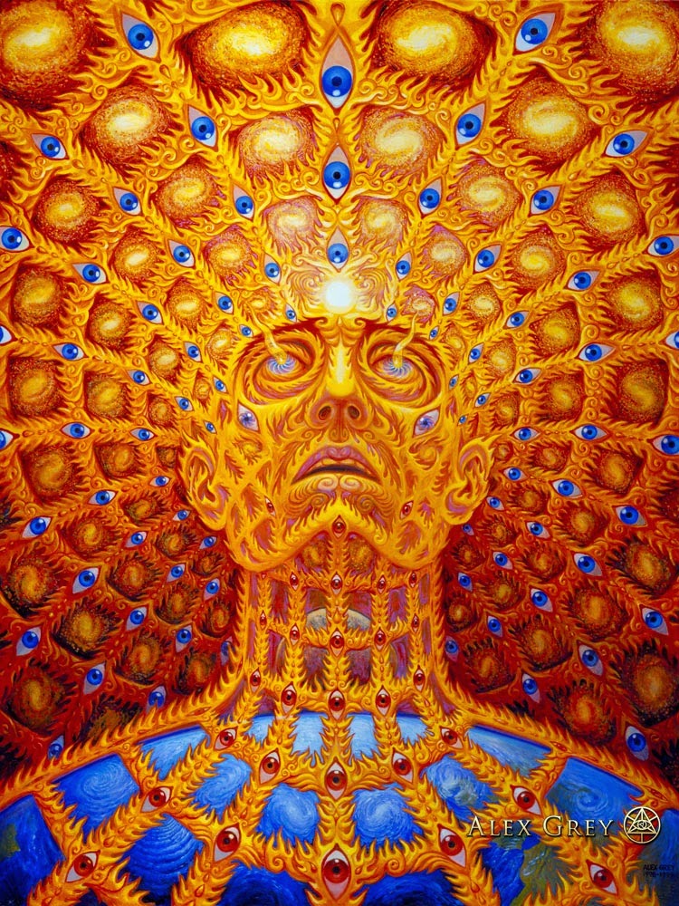 Alex Grey, já muito conhecido na cultura psicodélica, é um grande artista influenciado pelo seu pai (artista gráfico). Alex durante alguns anos trabalhou no departamento de Anatomia de Harvard Medical School, essa sua formação o preparou para as pinturas dos Espelhos Sagrados.